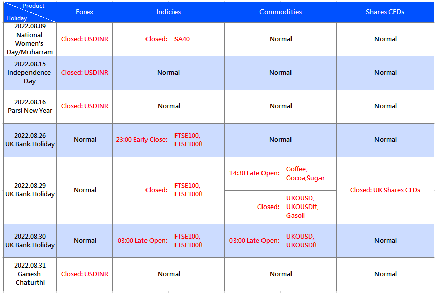 受到 8 月国际节假日影响,VT Markets 部分产品交易时间将有所调整,详情请查看如下: