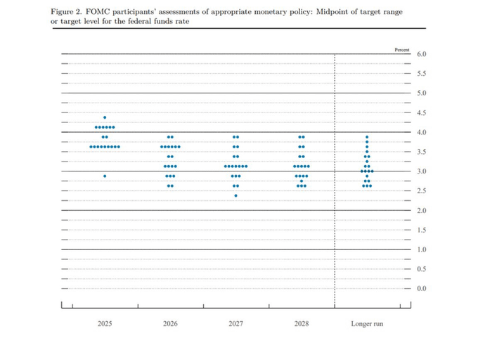 在2026年3月的FOMC会议(联邦公开市场委员会会议,美联储的利率决策会议)上,官员以11比1投票决定,维持政策利率(基准利率)不变,区间为3.50%至3.75%。表面上看,这是稳健、克制的决定。点阵图(dot plot:每位官员对未来利率的预测“点”,用来反映整体倾向)的中位数仍指向2026年降息一次。