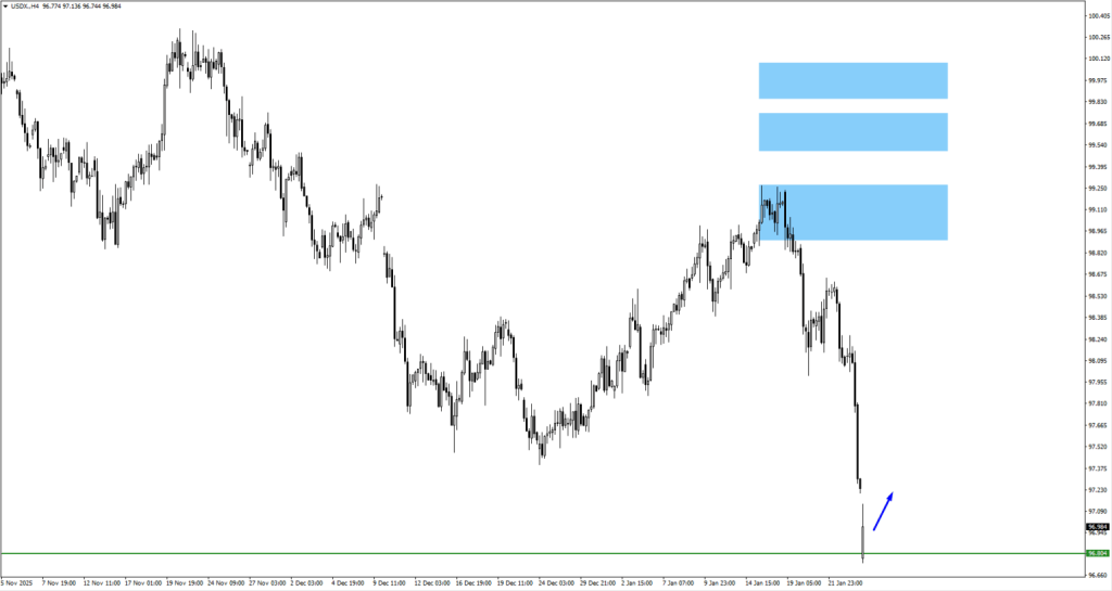 – 美元指数自 98.70 区域回落,并已跌破 96.804。