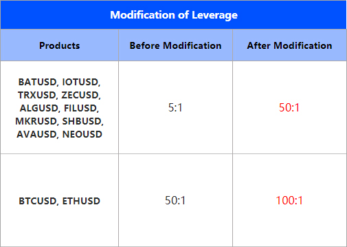 1. The leverage of BATUSD, IOTUSD, TRXUSD, ZECUSD, ALGUSD, FILUSD, MKRUSD, SHBUSD, AVAUSD and NEOUSD will be 50:1.