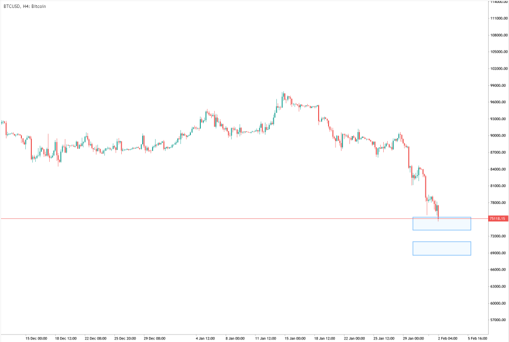 – Bitcoin extends its bearish momentum towards the $75,000 support level.