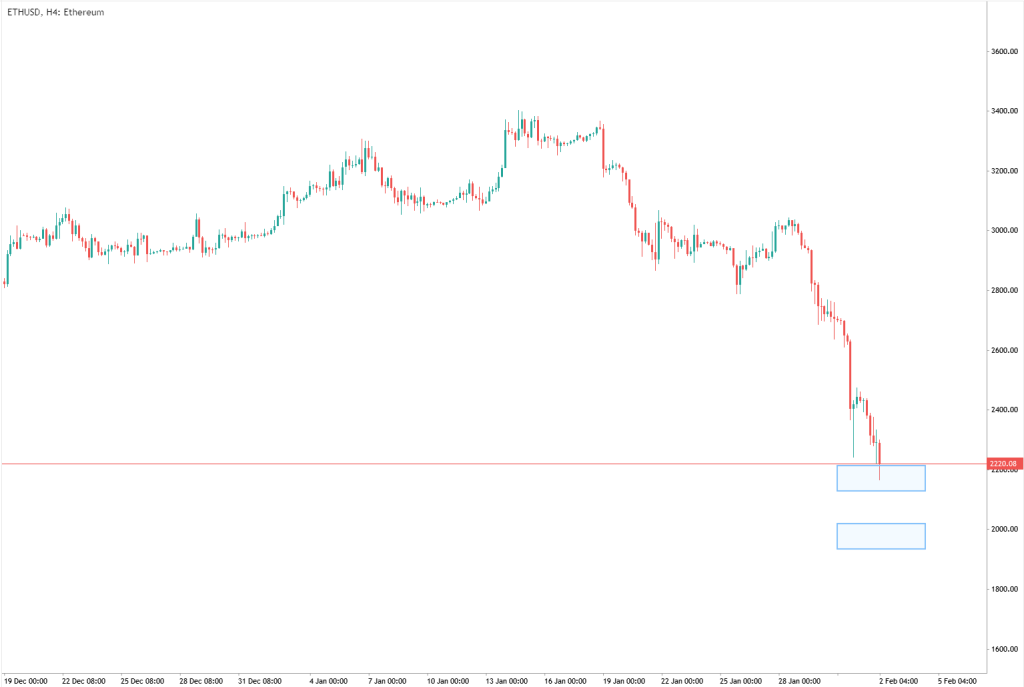 – Ethereum is testing the current support level, priced at 2200.
